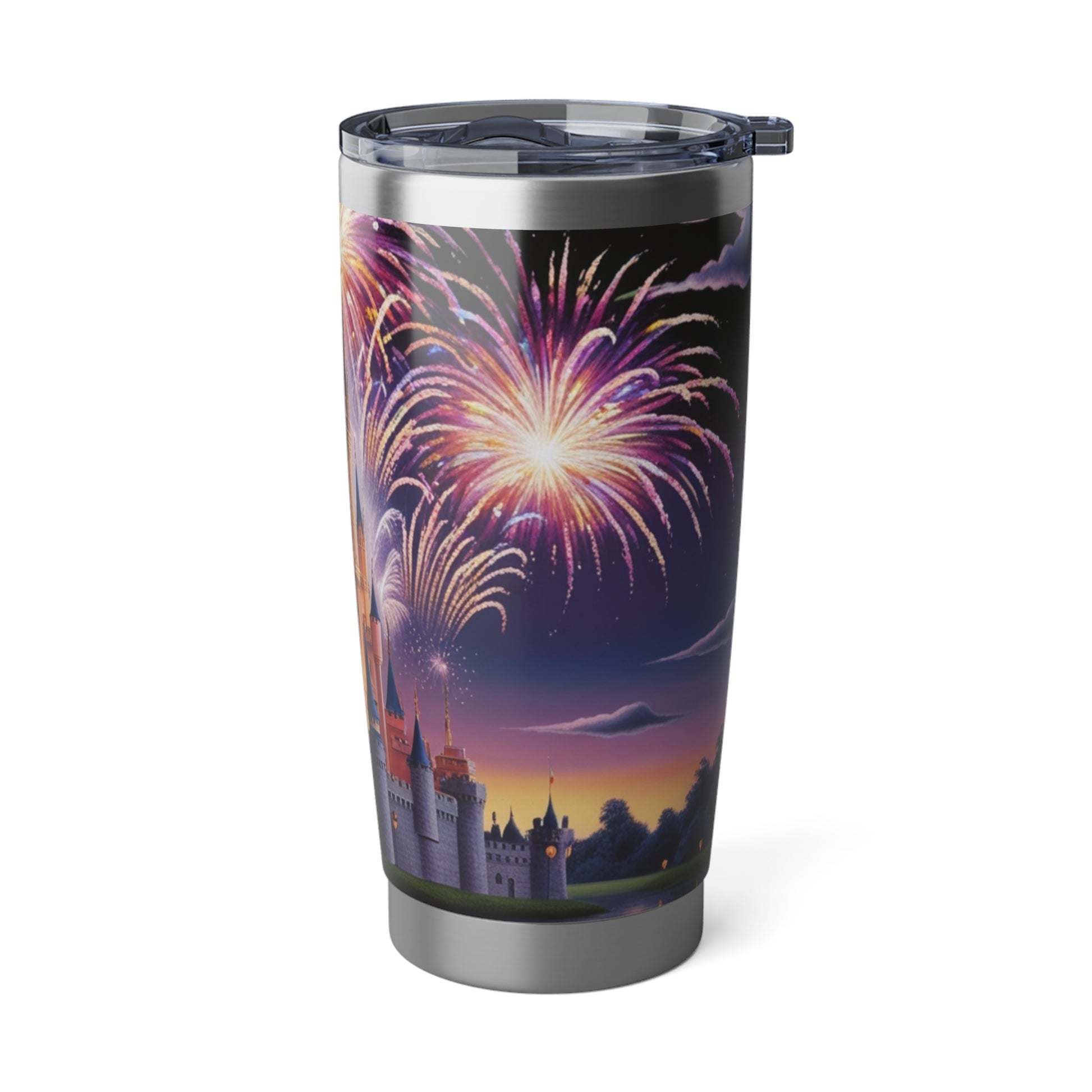 Feel the magic with this Castle and Fireworks 20 oz tumbler. Perfect fans of magical adventures. Ideal for sipping hot cocoa during the holiday season or enjoying a refreshing drink in the summer.