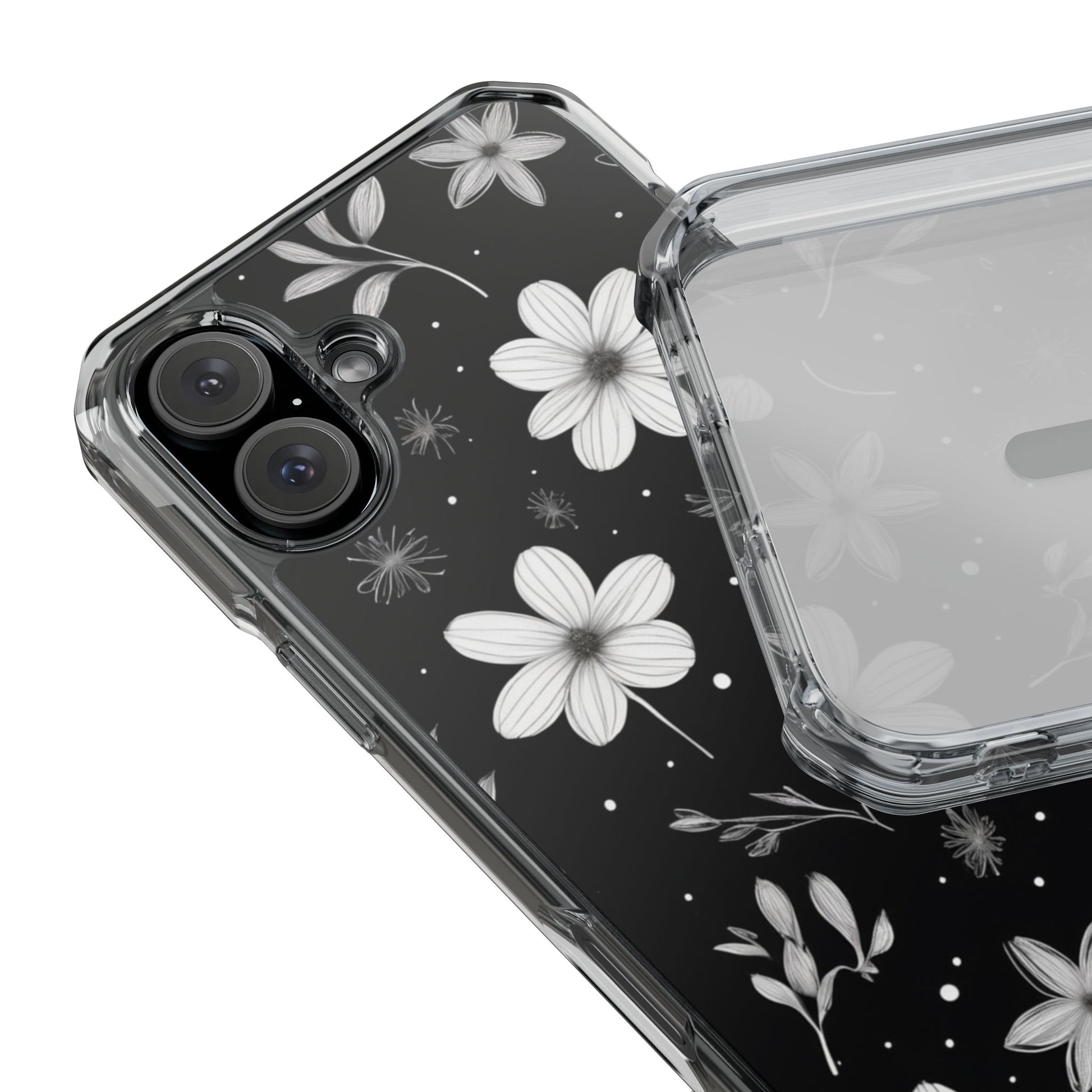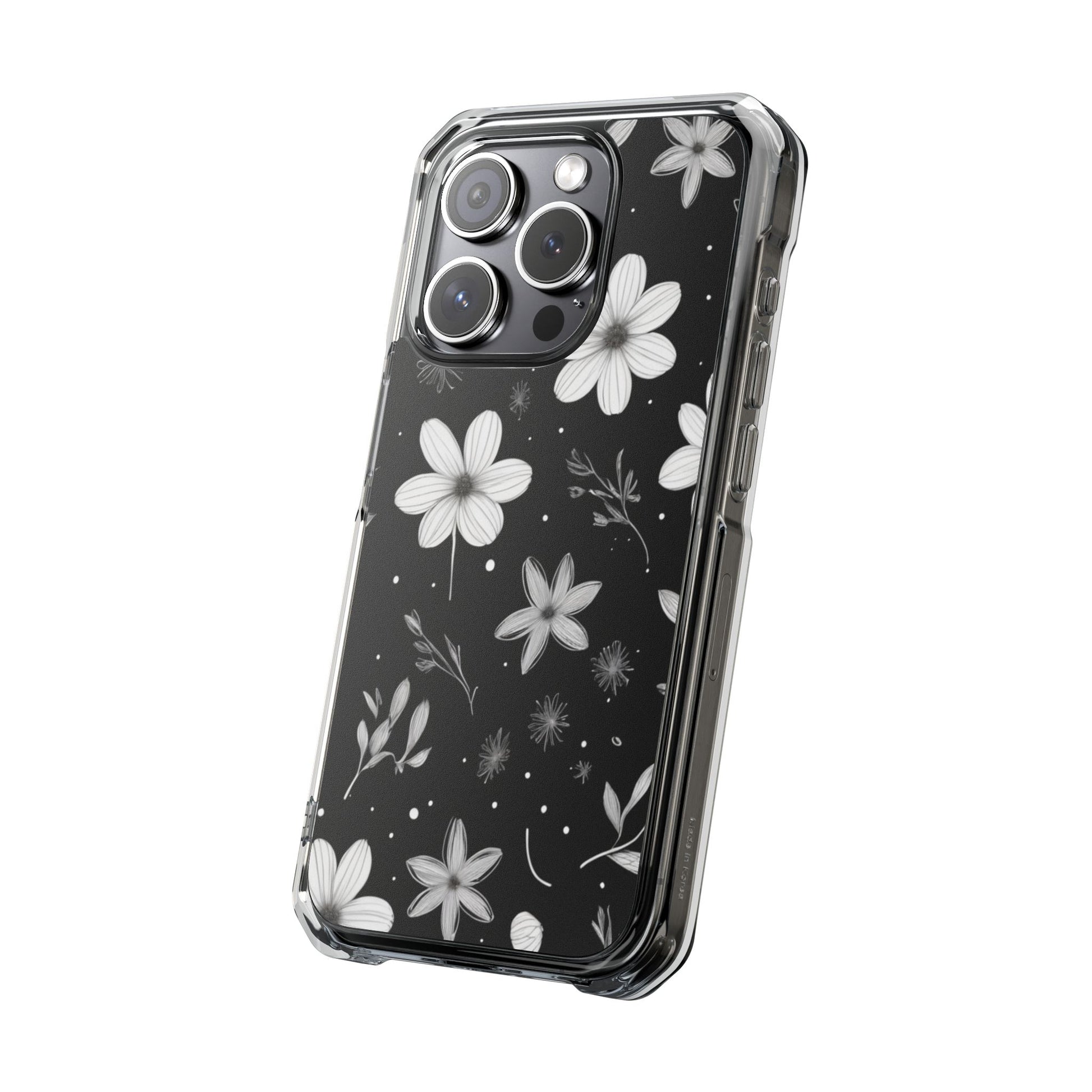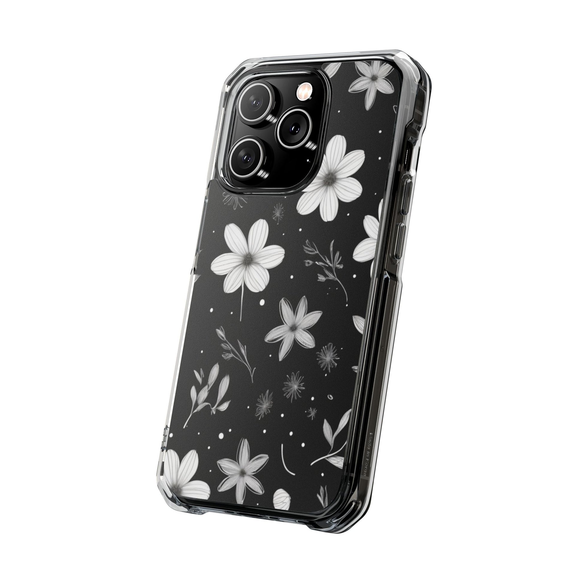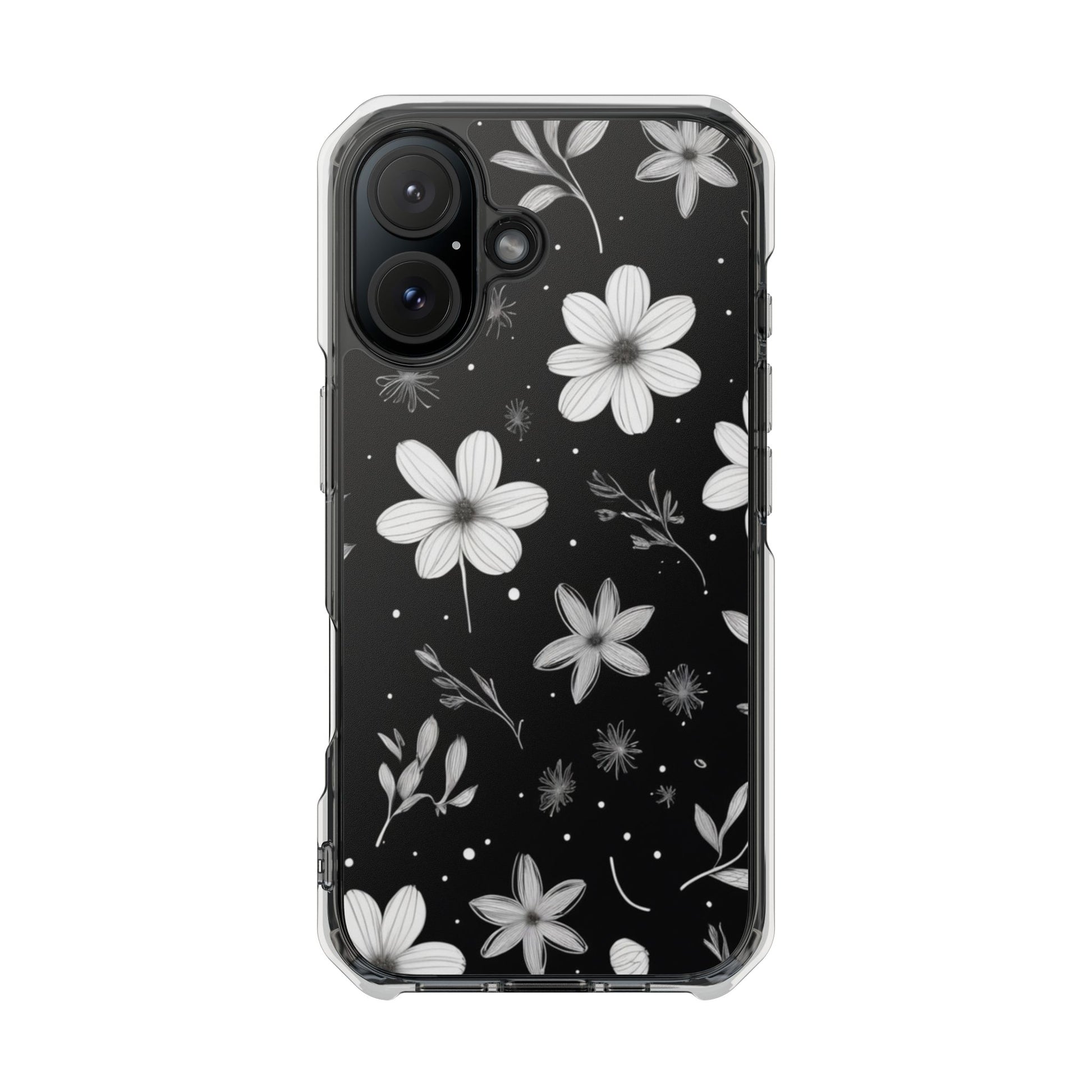 Chic Black and White Floral Print Magnetic Clear Impact Case for iPhone 16 15 14