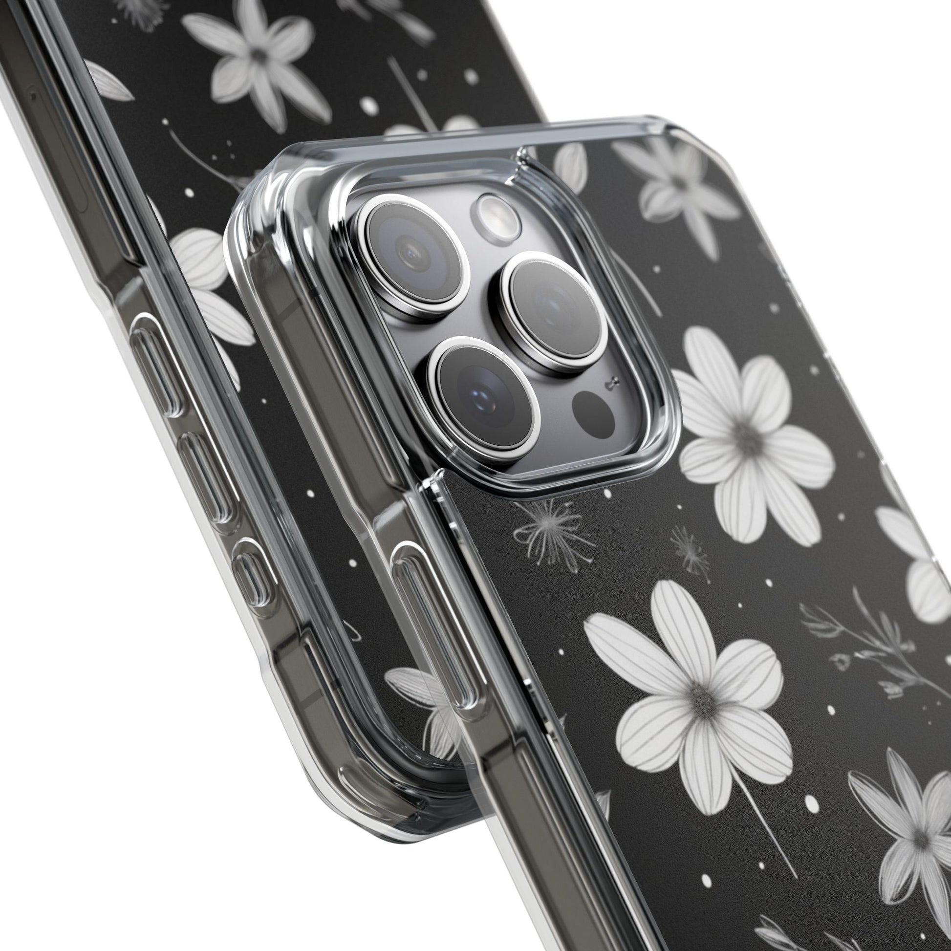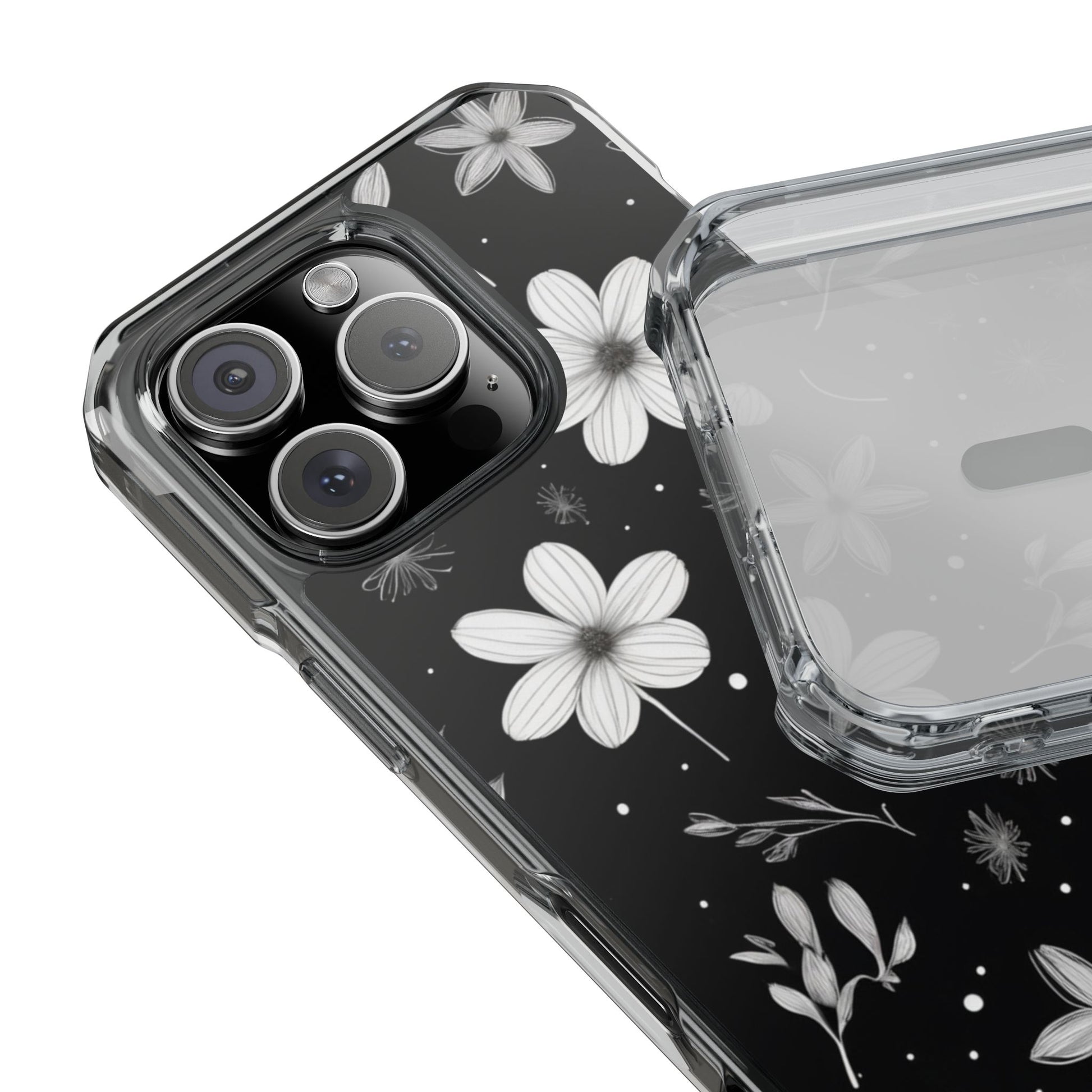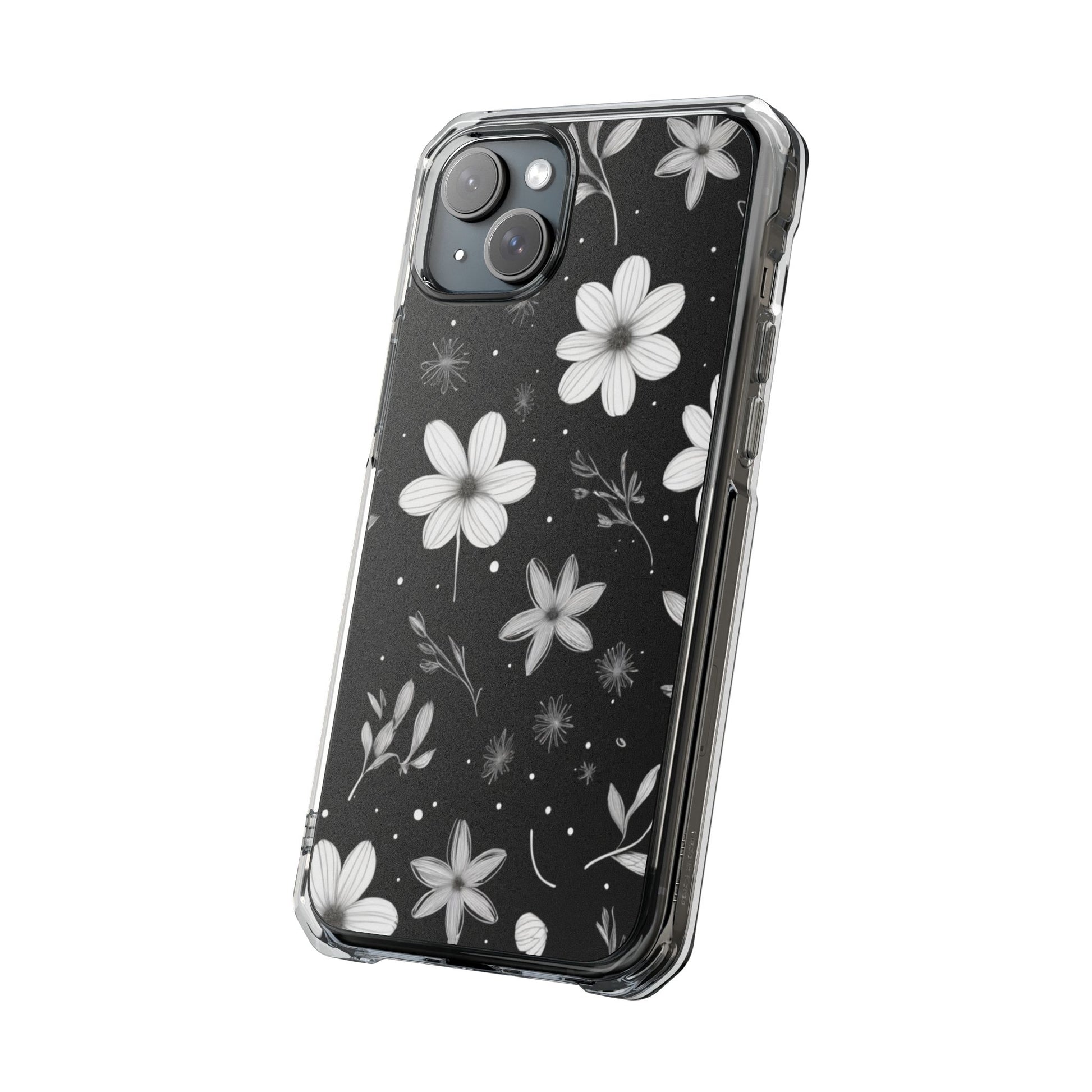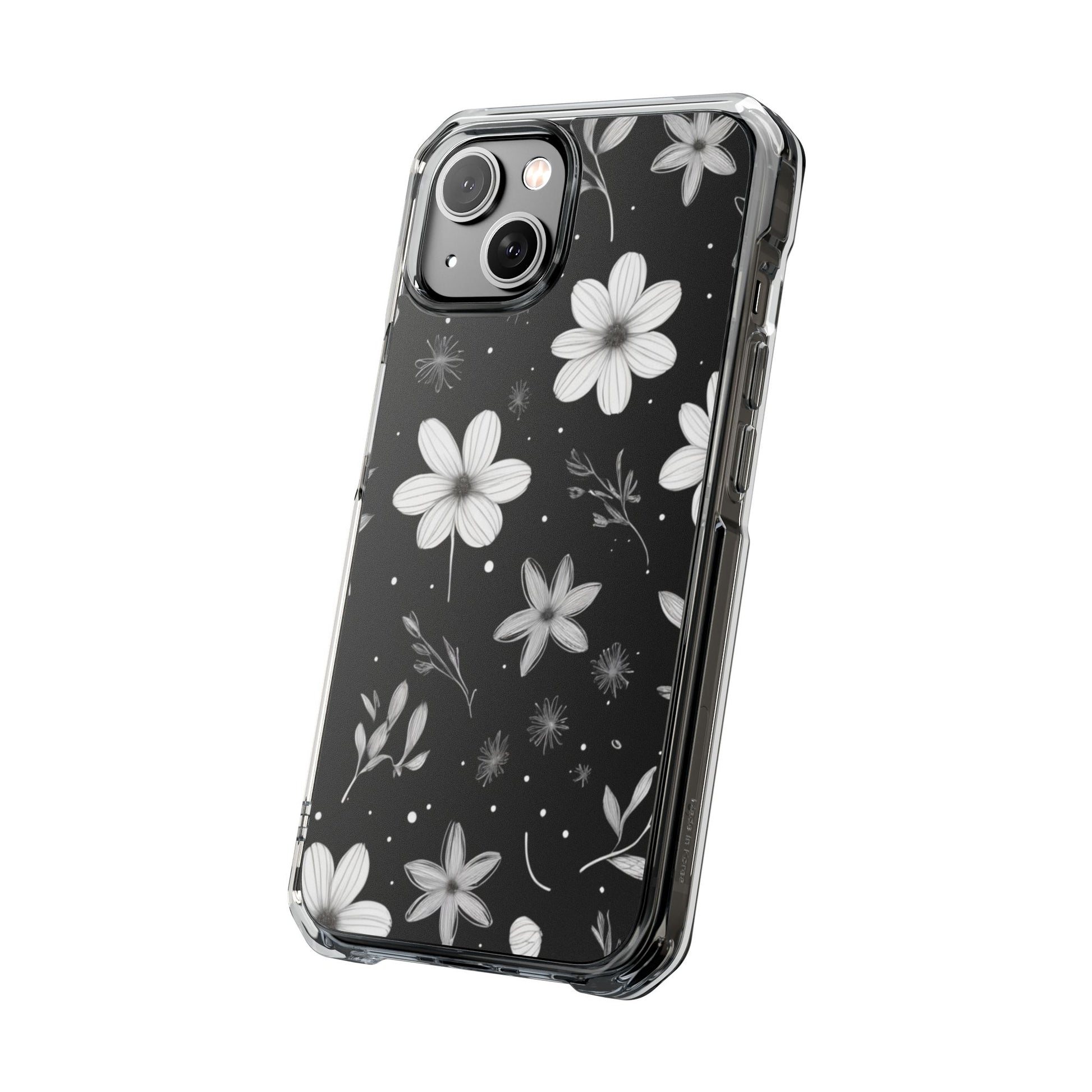 Chic Black and White Floral Print Magnetic Clear Impact Case for iPhone 16 15 14