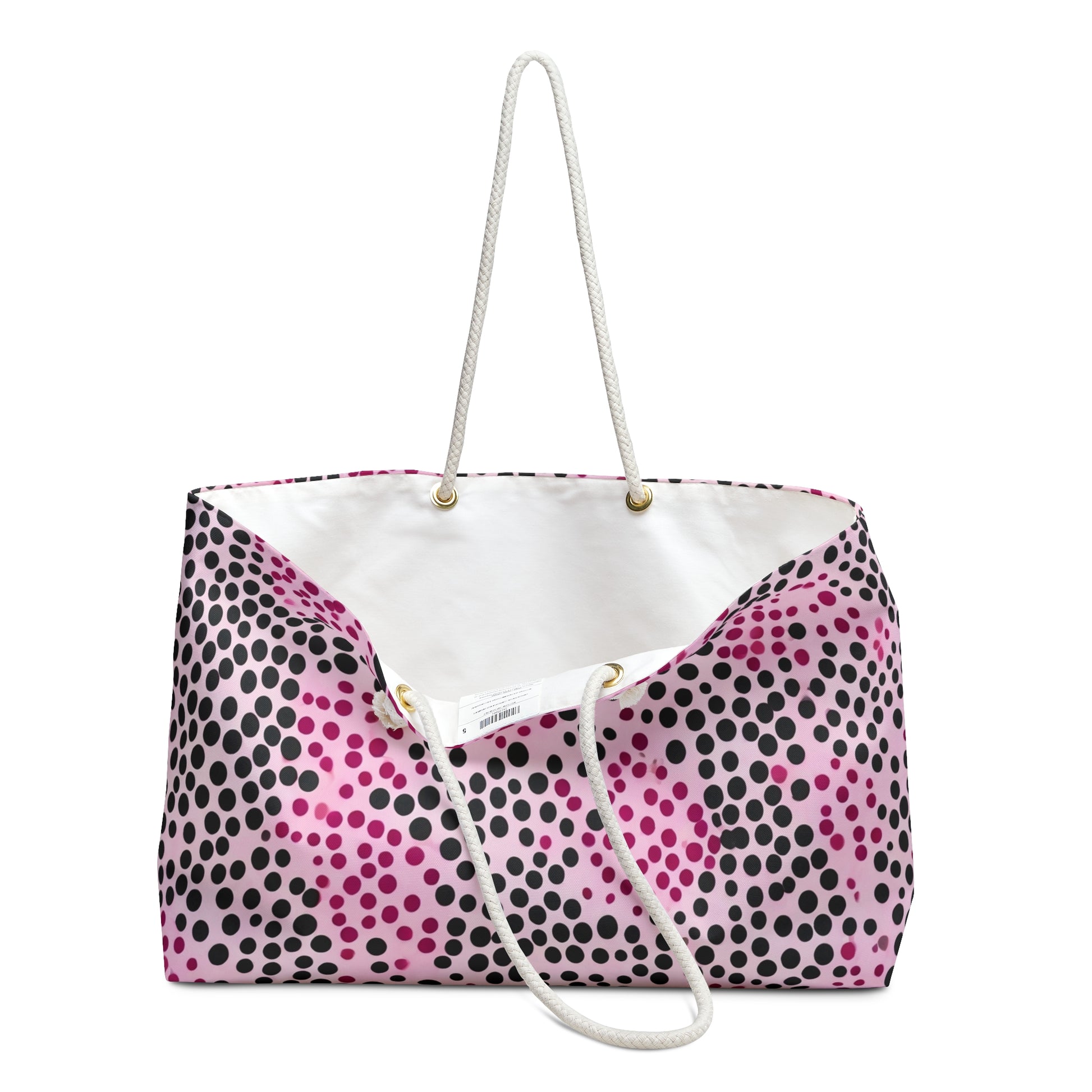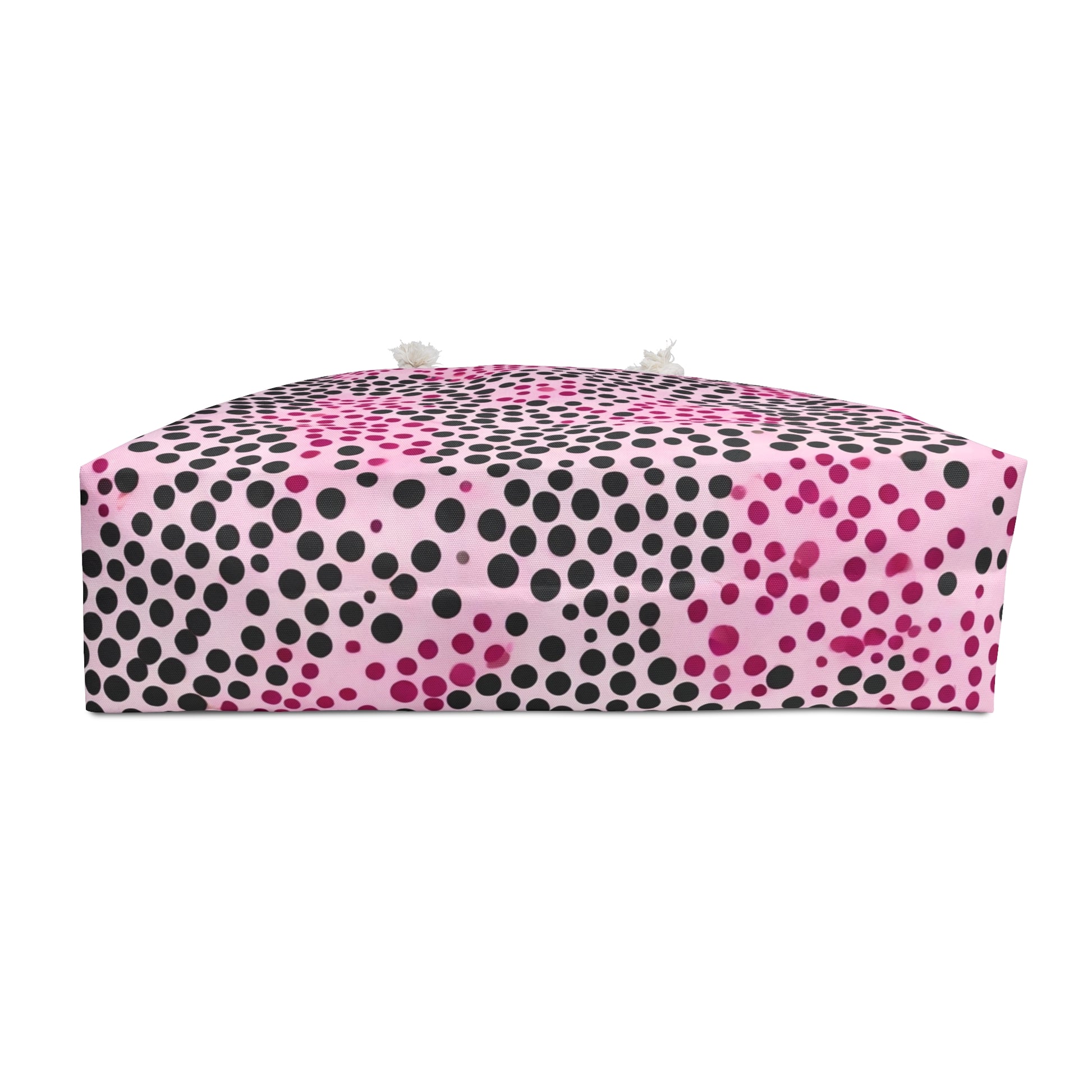 A stylish Weekender Bag in pink and black polka dot design, perfect for weekend getaways or overnight trips. This bag gives off a fun and playful vibe, and is suitable for anyone who loves to travel or needs a spacious bag for their essentials. Ideal for holidays, vacations, or short trips.