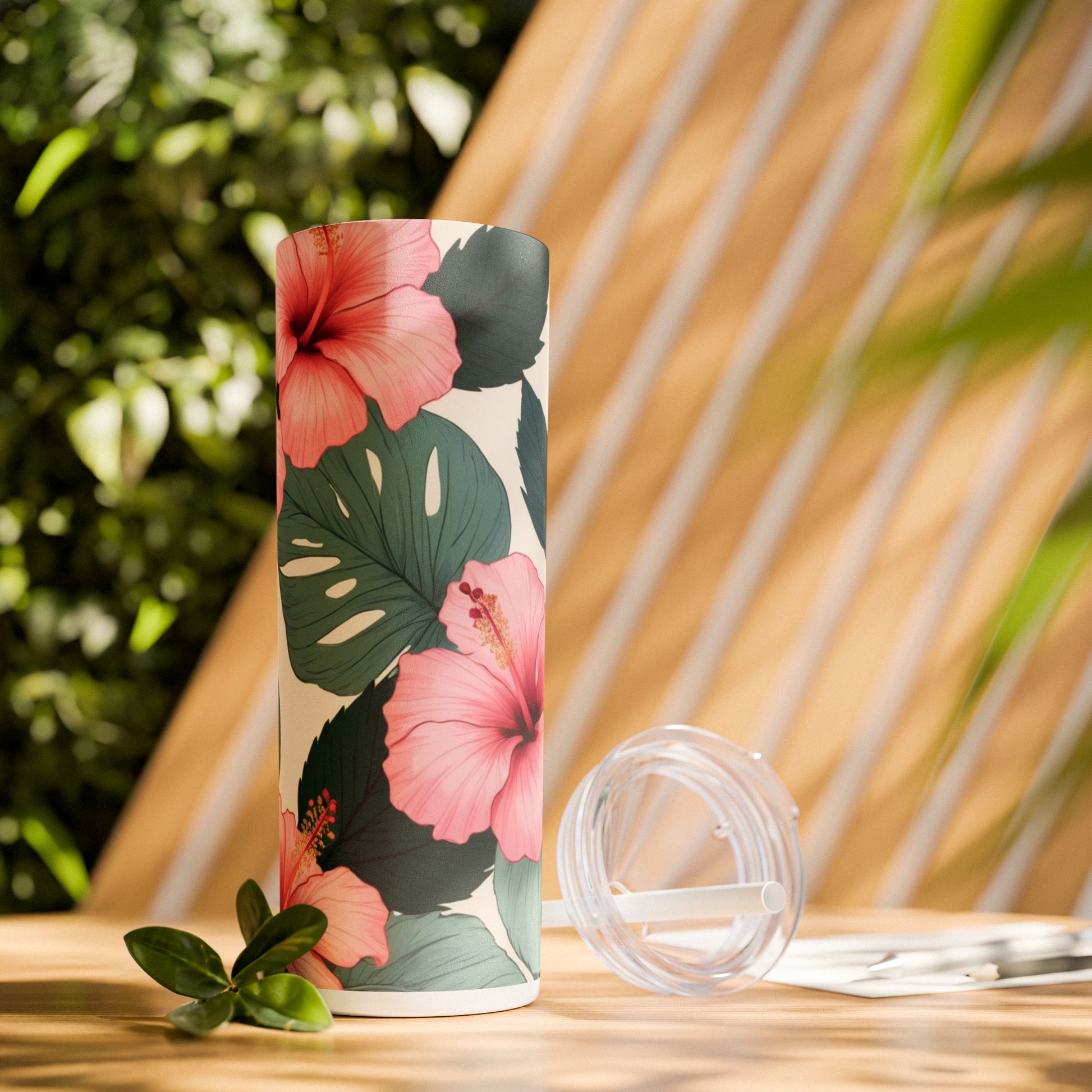 Stay hydrated in style with this tropical hibiscus flower skinny tumbler. The vibrant colors and tropical design give off a fun and summery vibe. Perfect for anyone who loves colorful and unique drinkware, this tumbler is ideal for picnics, beach days, and outdoor adventures.
